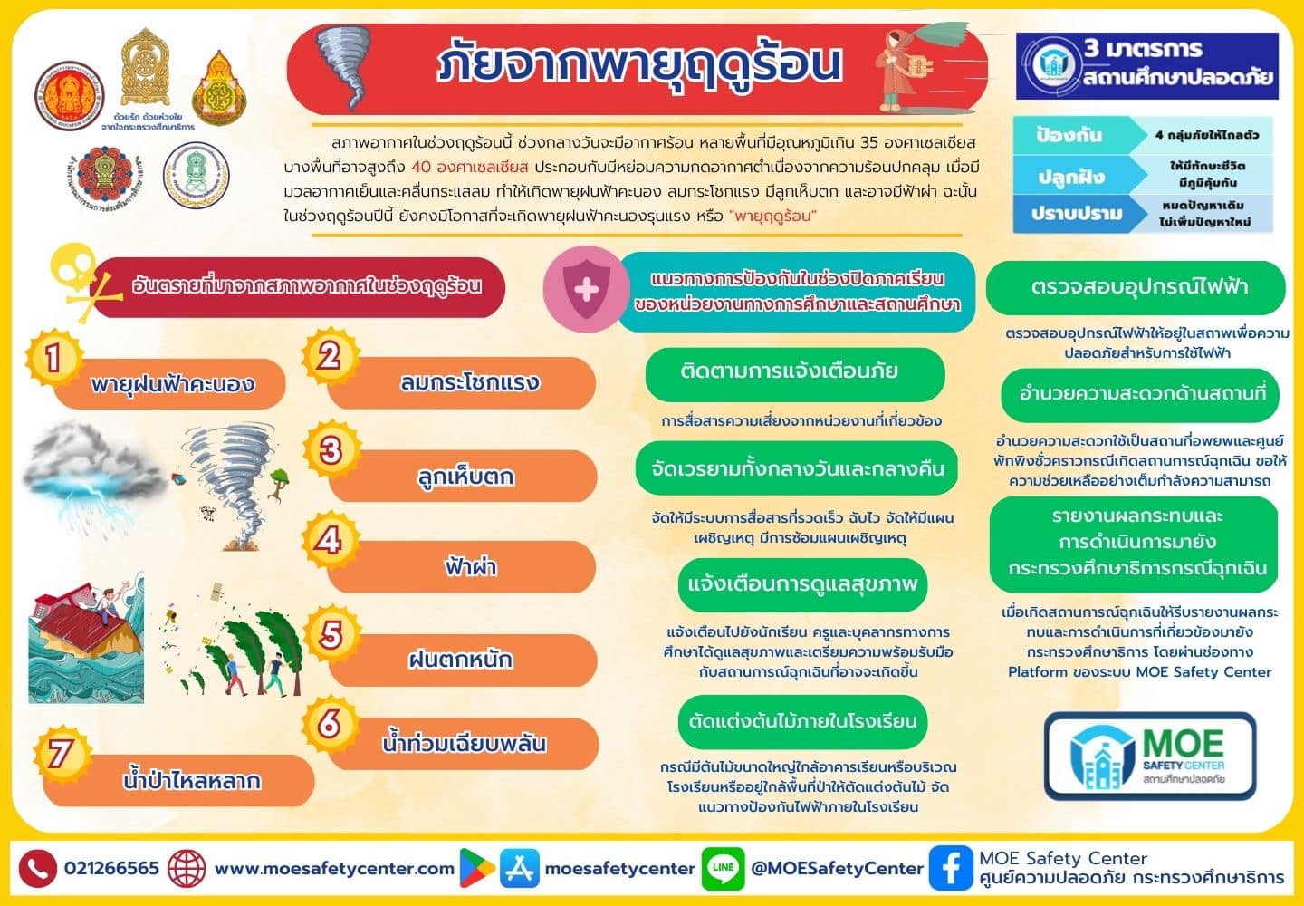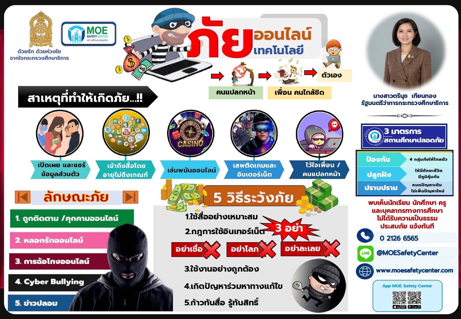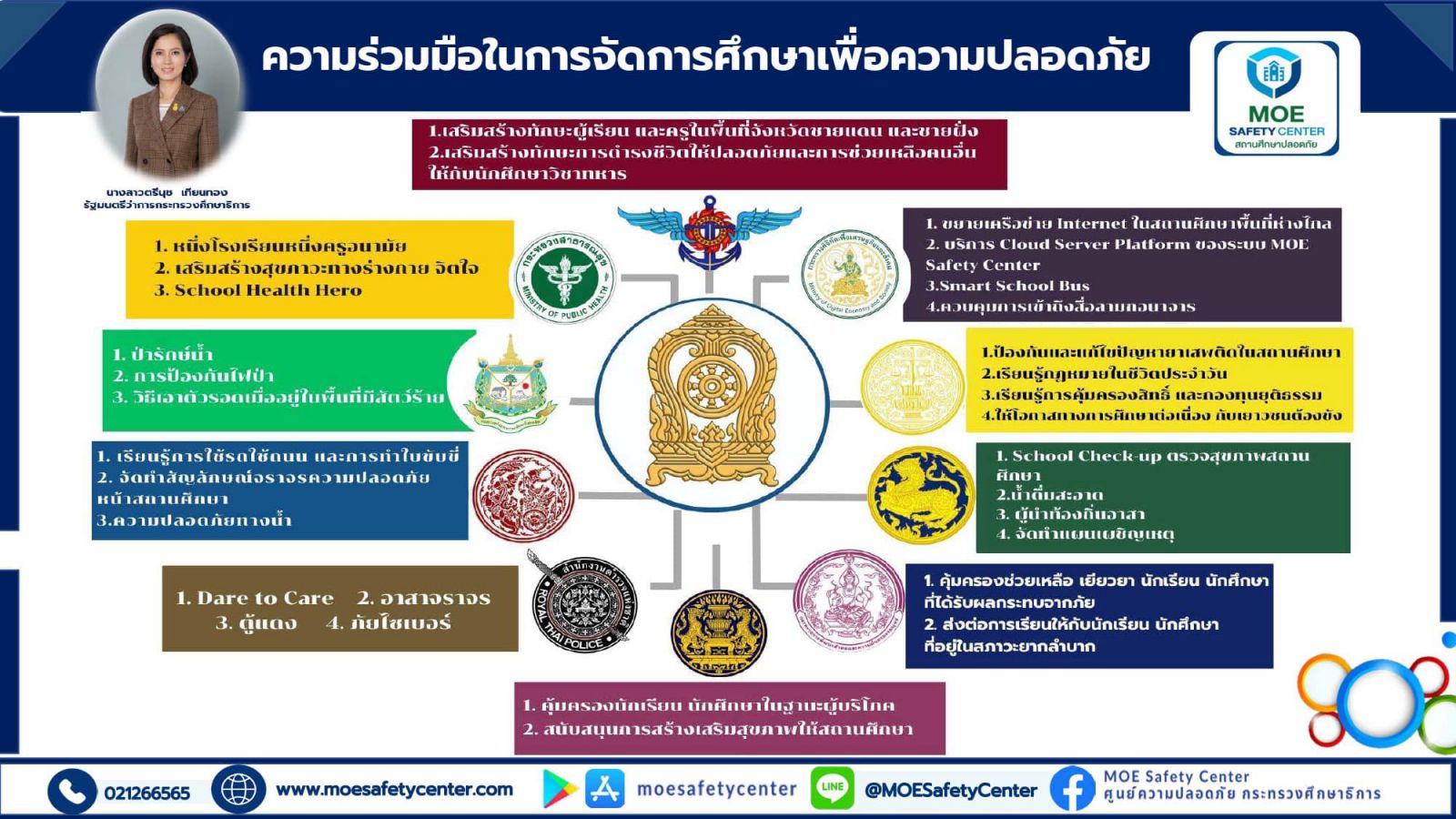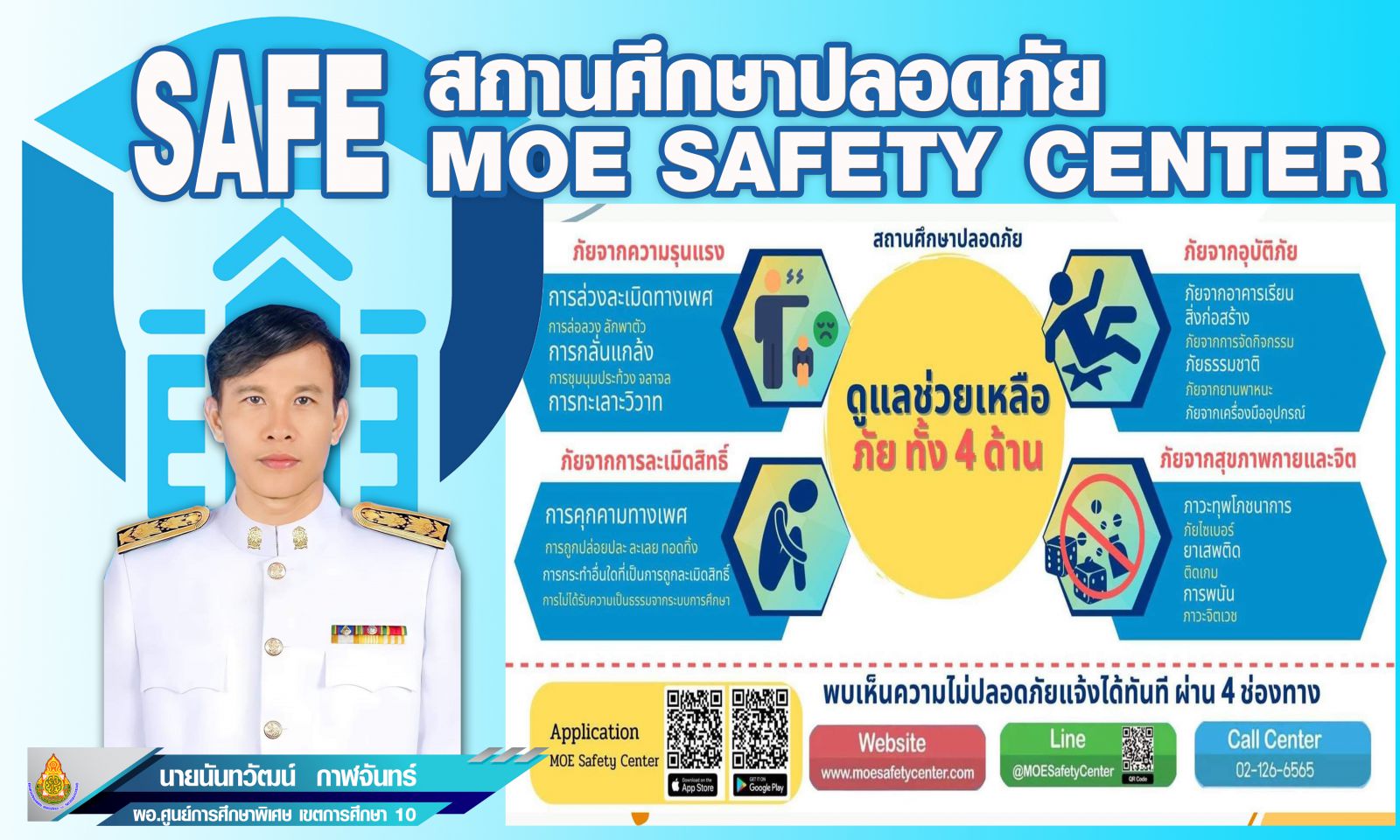 ประชาสัมพันธ์ช่องทางการแจ้งเหตุผ่านระบบ MOE-Safety-Center ซึ่งเป็นระบบมาตรฐานความปลอดภัยในสถานศึกษาโดยใช้หลัก Digital Based