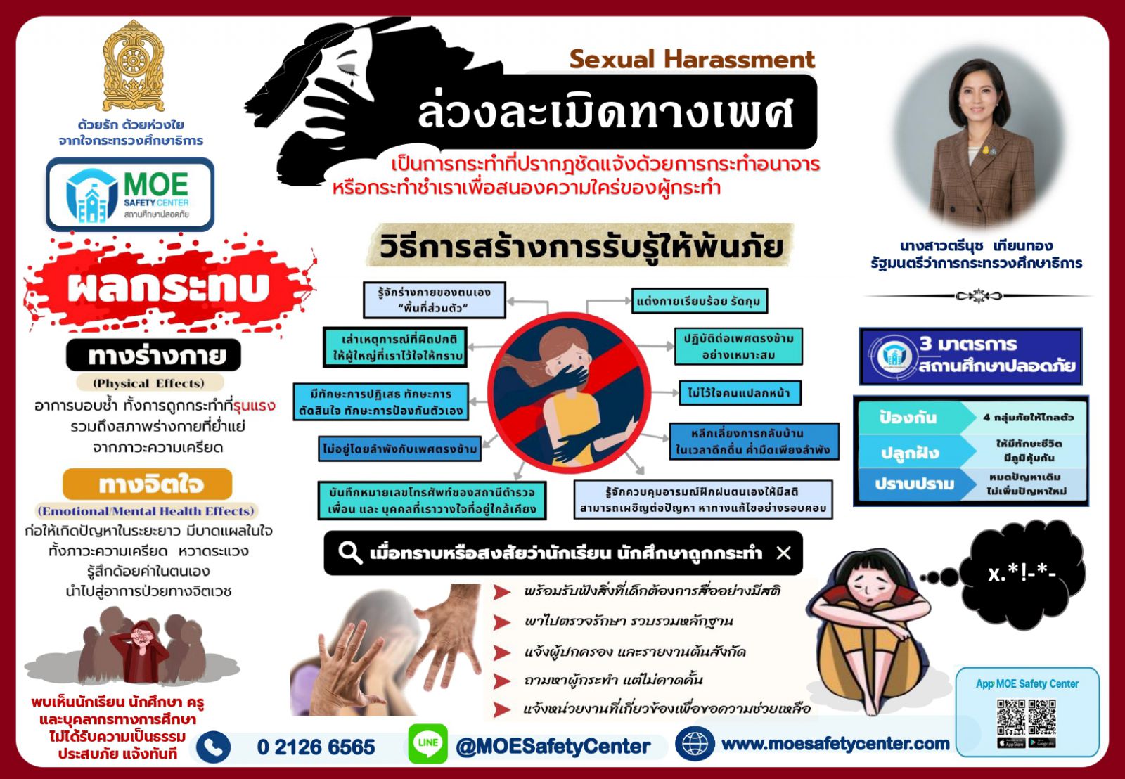สามารถร้องทุกข์ร้องเรียน หรือเตือน โดยผ่านระบบ MOE Safety Center มายังศูนย์ความปลอดภัย กระทรวงศึกษาธิการ ใน 4 ช่องทางได้แก่